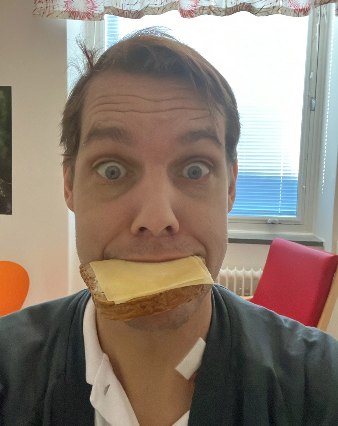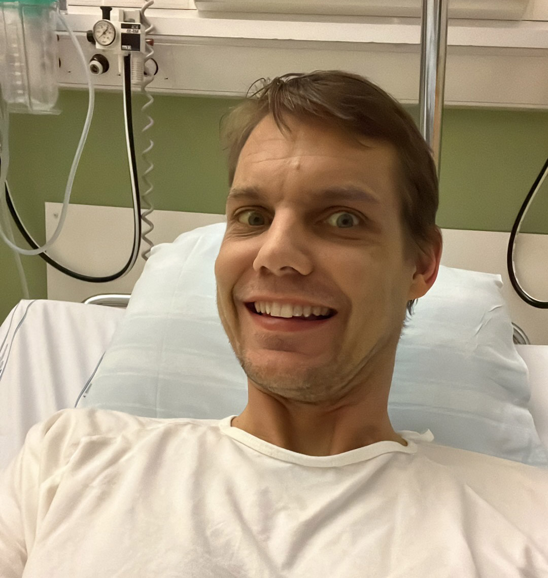 Och eftersom man måste vara fastande så var jag jättehungrig på kvällen/natten och började fantisera om att få äta en pizza. Väl hämtad och på väg till operation så skojade jag lite med de sköterskor och narkospersonal som tog emot mig utanför operationssalen, så jag var väldigt avslappnad, fast lite nervös inombords. Väl uppe på operationsbordet, eller bordet och bordet. Det var som att ligga i en solstol med vattenuppvärmd dyna. Den var så otroligt skön att ligga på. Där lades jag på rygg med armarna rakt ut åt sidorna. Narkosläkaren pratade lite med mig och sa att nu kommer jag få en mask över mun och näsa med ren syrgas för att syresätta blodet så mycket som möjligt. Där låg jag och andades i någon eller ett par minuter. Det kändes inte länge i alla fall innan en narkossköterska sa att nu kommer vi att söva dig och det görs genom nålen/infarten (pvk) som jag redan hade i höger armveck. Det tog bara några sekunder så somnade jag. Och som sagt, så kändes det för mig som om det tog två sekunder så vaknade jag igen och då, om jag minns rätt så var jag nog sövd i ca 10h och operationen tog ca 7 timmar om jag har kalkylerat rätt. Vid uppvaknandet var det första jag sa att jag var sugen på pizza. Jag var nog kvar i tanken från innan jag rullades in om att jag var hungrig. När jag väl började förstå vart jag befann mig så var det på CIVA, var där några timmar men blev sedan flyttad till avdelning 22 för postoperativ intensivvård.