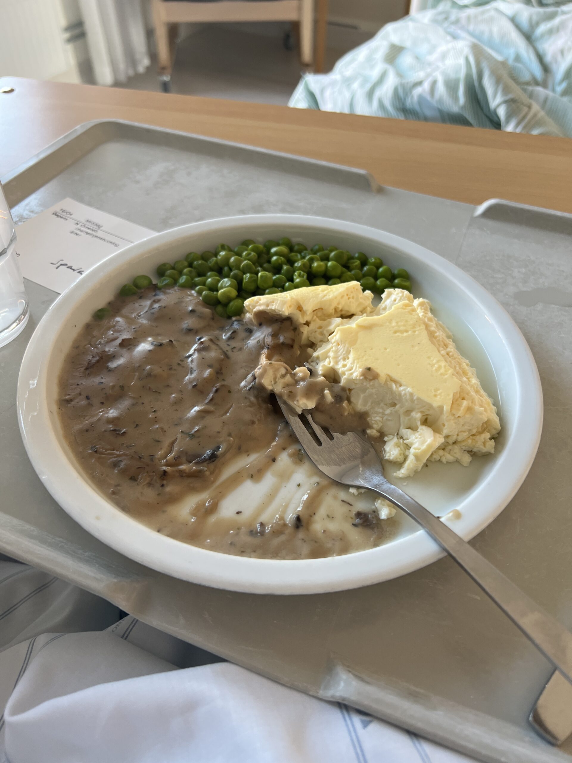 På avdelning 139, så kommer strax den första maten in. Det känns jättekonstigt att äta. Det var en omelett med champinjonstuvning och ärtor.