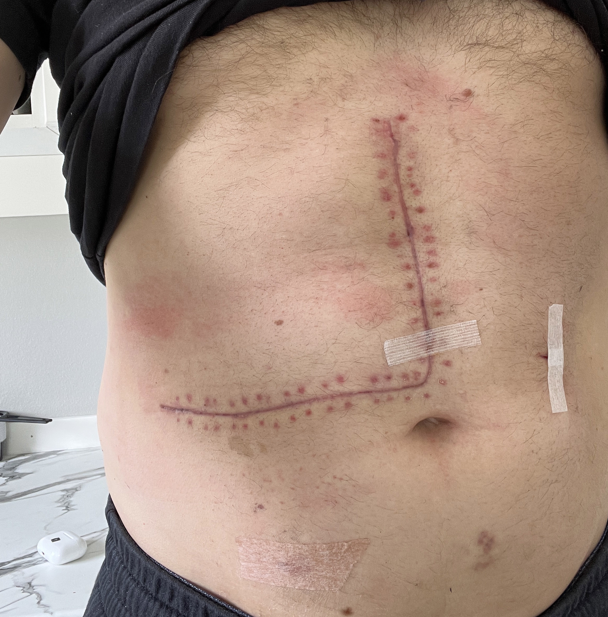 Det blev återbesök på sjukhuset två gånger i veckan första två veckorna och därefter en gång per vecka. Efter 3,5 veckor så tog de bort stygnen (eller agraffer som det heter) på magen. Och efter en månad från operationen så tog de bort omplåstringen då operationsärret har läkt riktigt bra och fint så går nu vid tillfället när jag skriver detta bara med lite kirurgtejp över ärret för att ärret inte ska belastas för hår nu i början.